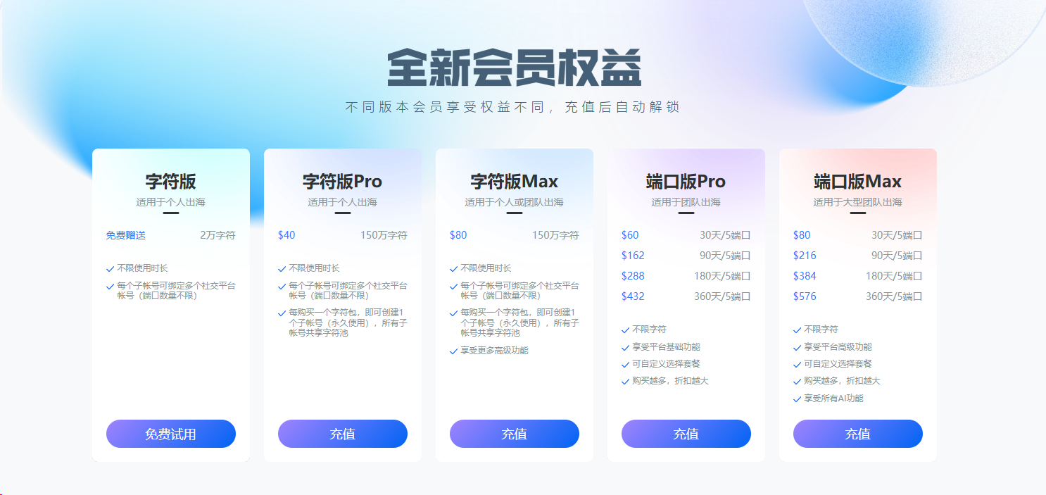 端口版(适合专业团队/MCN):翻译不限字符,支持多账号规模化协同,在大业务量下边际成本极低,且包含高级风控功能 。